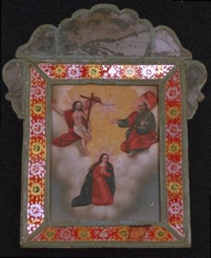Title: Father, Son, Holy Ghost, and Mary Artist: Unknown Median: Oil on Leaded Glass Size: 12in x 20in